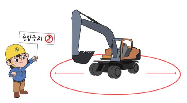 >> 굴착기 붐·암·버킷 등의 선회로 위험을 미칠 우려가 있는 장소는 관계근로자 외 출입금지
