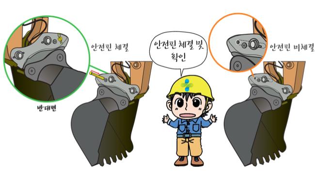 >> 사업주는 굴착기에 작업장치* 장착 시 안전핀 등 잠금장치 체결