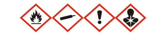 왼쪽부터 인화성, 고압가스주의, 경고, 흡인유해성